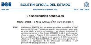 El objetivo de la reunión fue resolver dudas acerca del cumplimiento del Real Decreto 905/2025 de 7 de octubre, por el que se modifican el Real Decreto 640/2021, de 27 de julio, de creación, reconocimiento y autorización de universidades y centros universitarios, y acreditación institucional de centros universitarios; el Real Decreto 1509/2008, de 12 de septiembre, por el que se regula el Registro de Universidades, Centros y Títulos; el Real Decreto 1002/2010, de 5 de agosto, sobre expedición de títulos universitarios oficiales; y el Real Decreto 822/2021, de 28 de septiembre, por el que se establece la organización de las enseñanzas universitarias y del procedimiento de aseguramiento de su calidad.